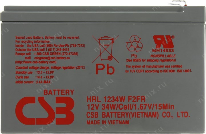 При циклическом использовании: 14.4В~15.0В при температуре 25°C, При использовании в режиме ожидания (буферном): 13.5В~13.8В при температуре 25°C