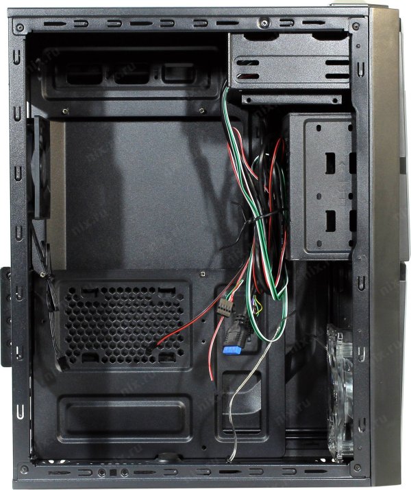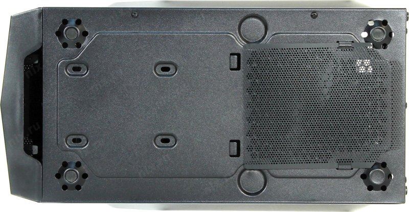 Снизу, с забором воздуха через фильтр снаружи корпуса, что обеспечивает лучшее охлаждение в системе и малошумность.