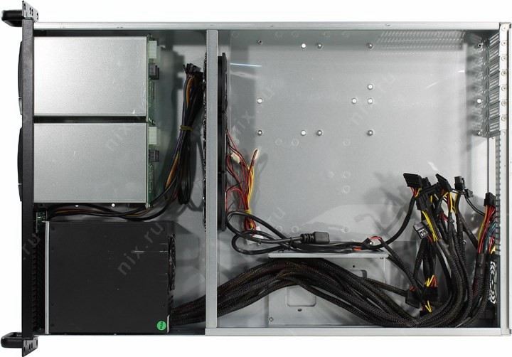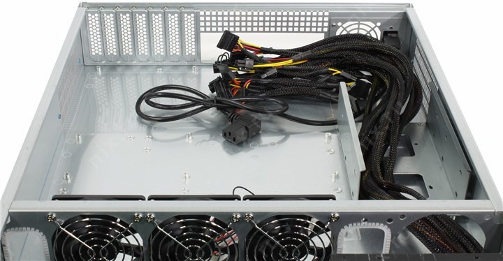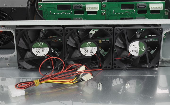 3 вентилятора: 80 x 80 мм, расположены на перегородке в средней части корпуса
