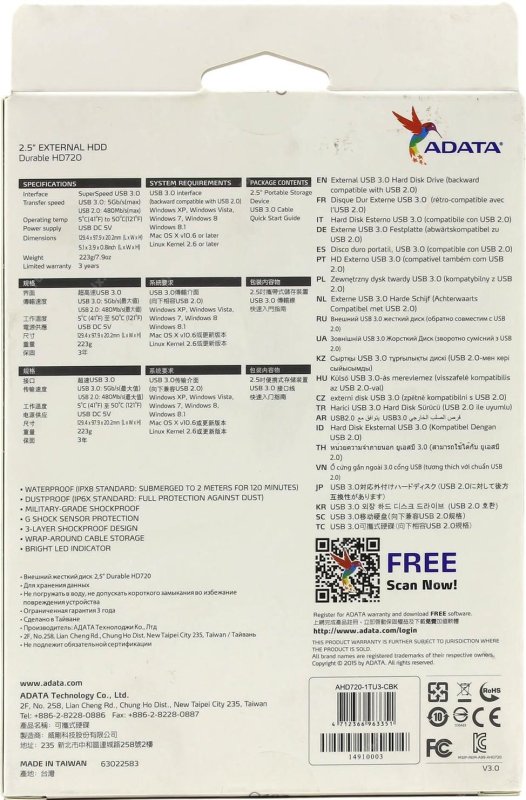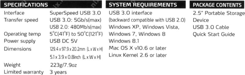 Защита от ударов. HDD соответствует американскому военному стандарту ударопрочности MIL-STD-810G 516.6При перегрузке (например, при ударе или тряске) включается акселерометрическая система защиты данных G Shock Sensor Protection и мигает красный индикатор. При возобновлении нормальной работы накопителя его индикатор горит или мигает синим цветом.