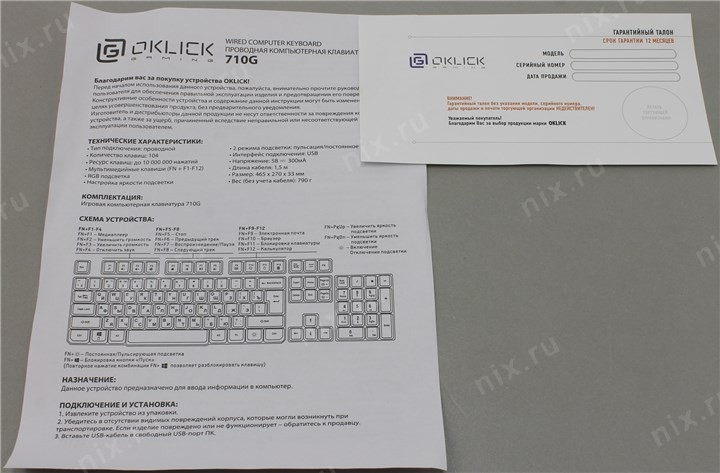 Клавиатура, руководство пользователя, гарантийный талон
