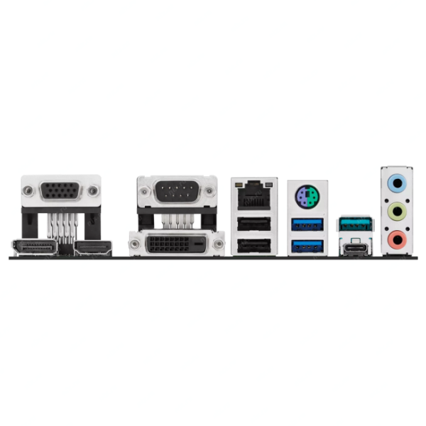 USB разъемы на задней панели: 2x USB 3.1 Gen2, 2x USB 3.0 (USB 3.1 Gen1), 2x USB 2.0; Видео разъемы на задней панели: HDMI, DisplayPort, 15-пиновый коннектор D-Sub, DVI-D; Порты: 1x RJ-45 LAN, 1x COM (внутренний коннектор), 1x LPT (внутренний коннектор)