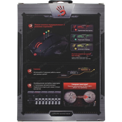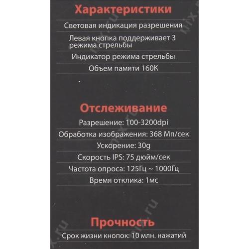 две линзы, встроенная фильтрующая линза, обработка изображения 3, 68 Мп/сек, скорость IPS 75 дюйм/сек, время оклика 1мс, световая индикация разрешения, левая кнопка поддерживает три режима стрельбы, индикатор режима стрельбы, объем встроенной памяти 160 Кб, Поддержка разрешений 4000 CPI