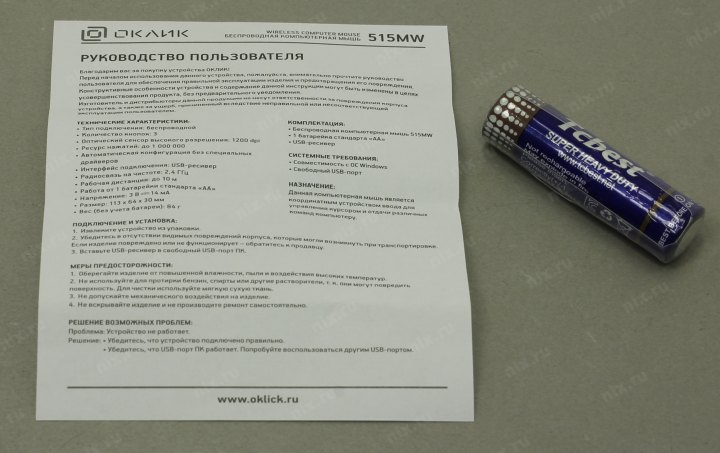 1 батарейка типа AA, USB-приемник