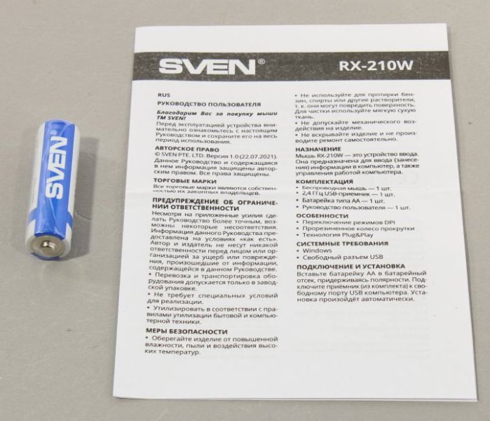 1 батарейка типа AA, USB-приемник