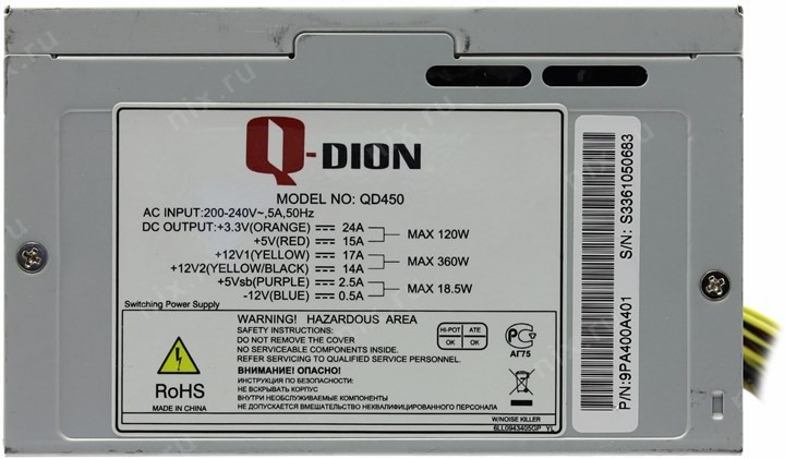 Максимальная нагрузка на каждую шину: Шины +3.3 В, +5 В - 120 Вт, Две линии +12 В - 360 Вт, Шины -12 В, +5 Вsb - 18.5 Вт; Шина -12 В: 0.5 А; Шина +12 В: Две линии - 17 А, 14 А; Шина +3.3 В: 24 А; Шина +5 В: 15 А; Шина +5 Вsb: 2, 5 А