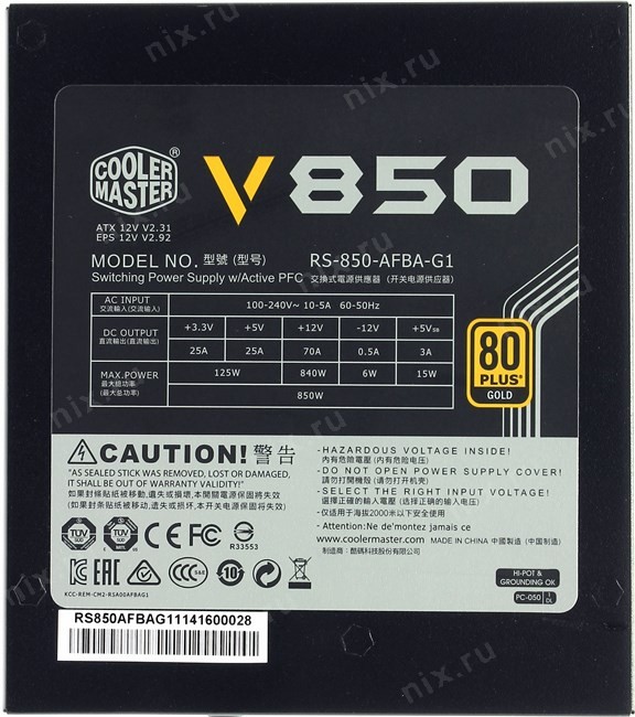 Максимальная нагрузка на каждую шину: Шины +3.3 В, +5 В - 125 Вт, Две линии +12 В - 840 Вт, Шина -12 В - 6 Вт, Шина +5 Вsb - 15 Вт; Шина -12 В: 0.5 А; Шина +12 В: 70 А; Шина +3.3 В: 25 А; Шина +5 В: 25 А; Шина +5 Вsb: 3 А