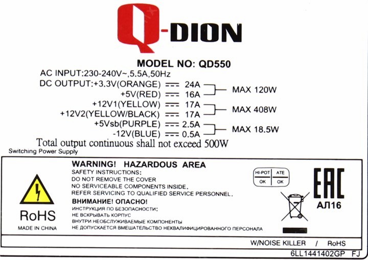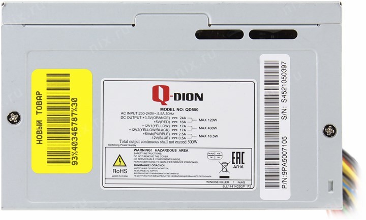 +3.3V - 24A, +5V - 16A, +12V1 -17A, +12V2 - 17A, +5VSB - 2.5A, -12V - 0.5A; Комбинированная нагрузка: +3.3V & +5V - 120 Вт, +12V1 & +12V2 - 408 Вт