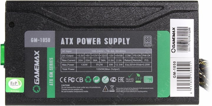 +3.3V - 20A, +5V - 20A, +12V1 - 38A, +12V2 - 38A, +5VSB - 2.5A, -12V - 0.5A