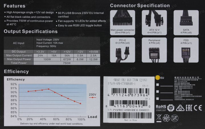 +3.3V - 24A, +5V - 18A, +12V - 56A, -12V - 0.5A, +5VSB - 2.5A; Комбинированная нагрузка: +3.3V&+5V - 100 Вт