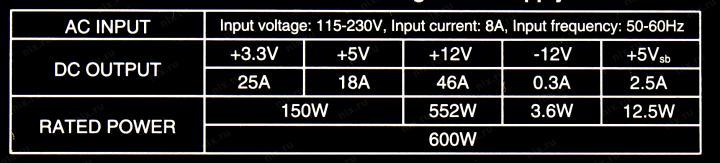 +3.3V - 25A, +5V - 18A, +12V - 46A, +5VSB - 2.5A, -12V - 0.3A ; Комбинированная нагрузка: +3.3V & +5V - 150 Вт, +12V - 552 Вт