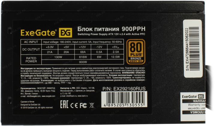 +3.3V - 21A, +5V - 20A, +12V - 68A, +5VSB - 2.5A, -12V - 0.5A ; Комбинированная нагрузка: +3.3V & +5V - 130 Вт