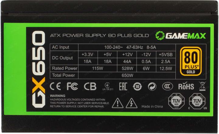 +3.3V - 15A, +5V - 15A, +12V - 44A, +5VSB - 2.5A, -12V - 0.5A
