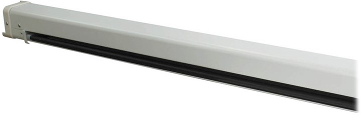 Корпус экрана для проектора: Корпус квадратного сечения имеет по всей длине внутренний выступ, предотвращающий произвольное развертывание полотна Корпус выполнен из стали с белым полимерным покрытием. Торцевые заглушки корпуса изготовлены из ударопрочного белого пластика.; Материал: Нижняя натяжная стальная планка круглого сечения диаметром 13 мм с черным полимерным покрытием