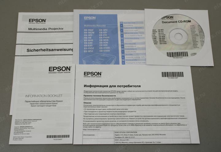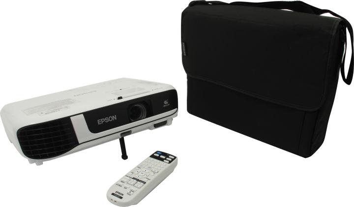 Кабель питания, кабель VGA, пульт ДУ, 2 батарейки типа AA, сумка