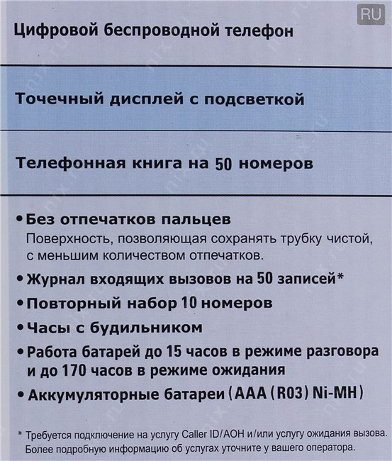 Дополнительно: Часы с будильником, Возможность установки на стене, 12 мелодий звонка, Голубая подсветка дисплея, Функция поиска трубки