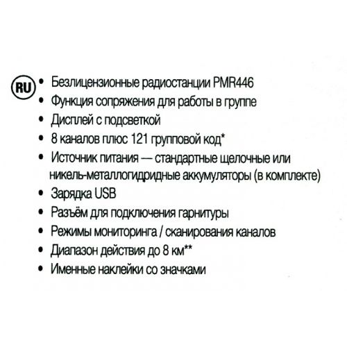 2 рации, 2 аккумулятора, зарядное устройств, 2 зажима для крепления на ремне