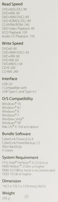 Совместимость с Windows и Mac; Включает два кабеля для интерфейсов USB Type-C и Type-A; Поддержка хранения архивных файлов M-DISC на 1000 лет; Скорость записи 8X DVD; Сверхтонкий 13-мм форм-фактор; Nero BackItUp полное решение для резервного копирования для Android-устройств.
