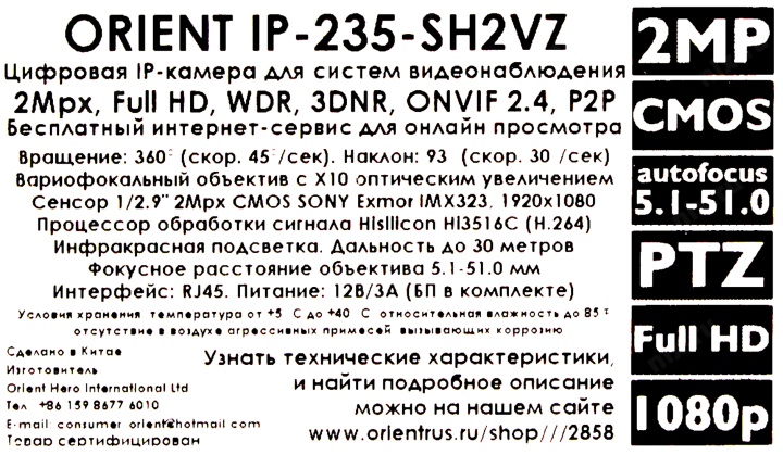 Размеры матрицы камеры: 1/2.9"; Сенсор: CMOS (SONY IMX323)