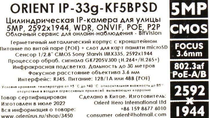 Размеры матрицы камеры: 1/2.8"; Сенсор: CMOS (Sony Starvis IMX335)
