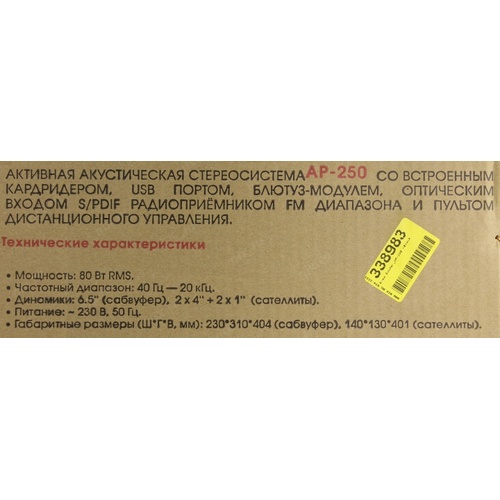 Сателлиты 2 x 15 Вт, Сабвуфер 50 Вт