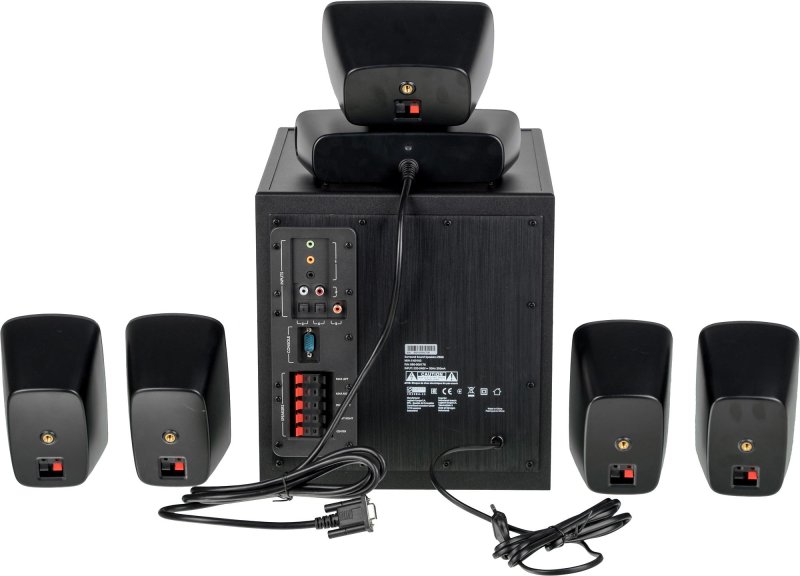 Встроенный декодер Dolby Digital. Внешняя консоль управления всей акустической системой. (1000Вт пиковая мощность/500Вт RMS, распределение RMS мощности указано в описании компонентов системы)