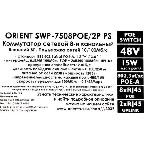 Порты Fast Ethernet: 10 портов 10/100 Мбит/сек, 8 из них PoE PSE, остальные Uplink