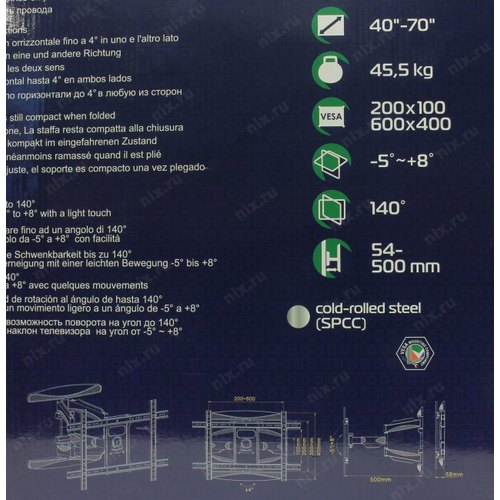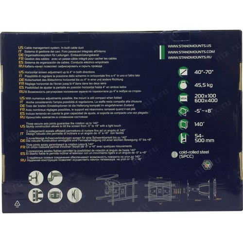 Универсальное крепление. Система двойного плеча. Кабель-канал. Ультратонкий дизайн и большой вылет от стены. Широкие возможности регулировки экрана.